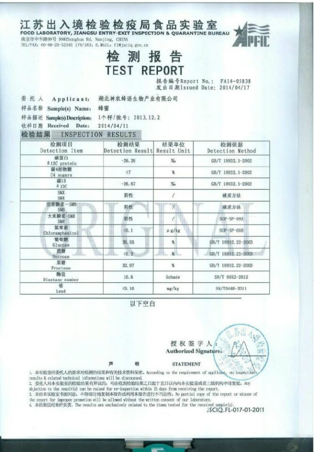 經(jīng)過耐心等待,神農(nóng)蜂語總經(jīng)理宋學(xué)喜已拿到江蘇出入境檢驗(yàn)檢疫局動(dòng)植物與食品實(shí)驗(yàn)室(中國(guó)目前2家檢測(cè)蜂蜜Z權(quán)威部門之一)對(duì)我們公司的蜂蜜做了如下檢測(cè),檢驗(yàn)結(jié)果Q部合格!