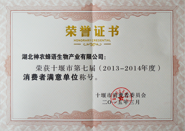今年3·15,十堰市消費者委員會在Q市范圍內(nèi)組織開展的十堰市第七屆“消費者滿意單位”、“消費者滿意商品”評選活動揭曉,湖北神農(nóng)蜂語生物產(chǎn)業(yè)有限公司榮獲2013-2014年度“消費者滿意單位”。