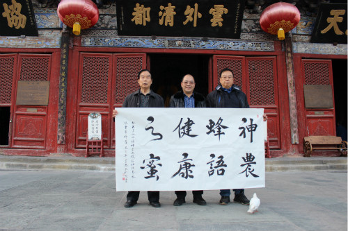 神農(nóng)蜂語總經(jīng)理宋學(xué)喜同中國蜂產(chǎn)品協(xié)會領(lǐng)導(dǎo)王啉(左)及趙小川(右)合影
