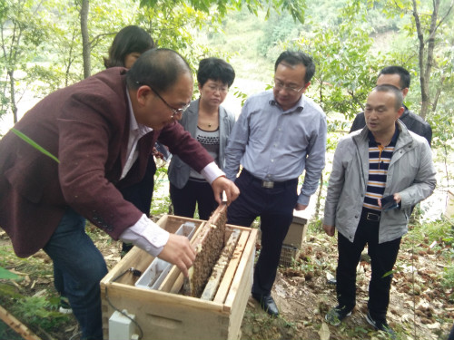 中共十堰市委書記張維國(右一)到鄖西六郎考察指導(dǎo)蜂產(chǎn)業(yè)扶貧工作